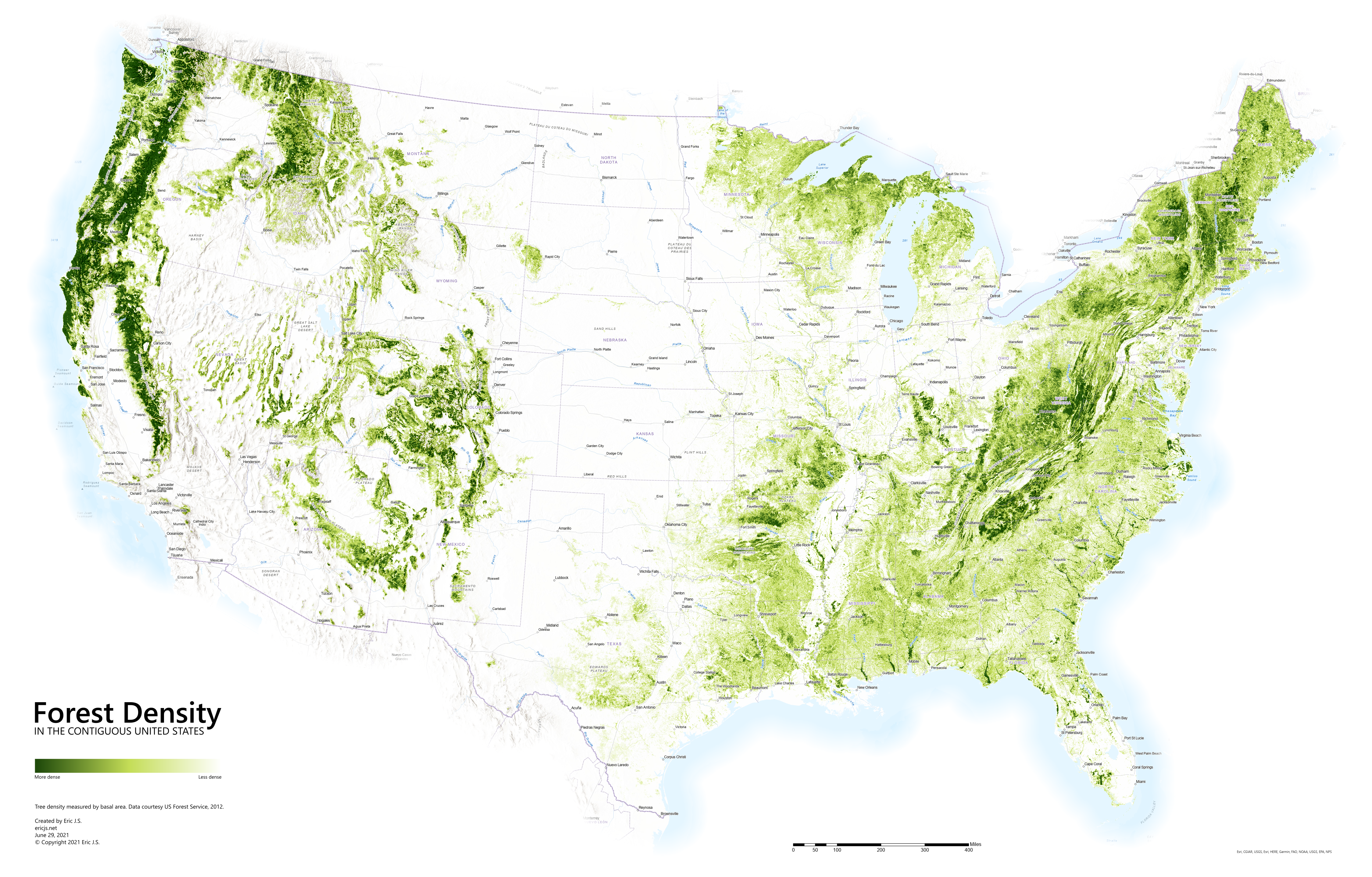 The densest forests in the contiguous US exist in the Pacific Northwest.