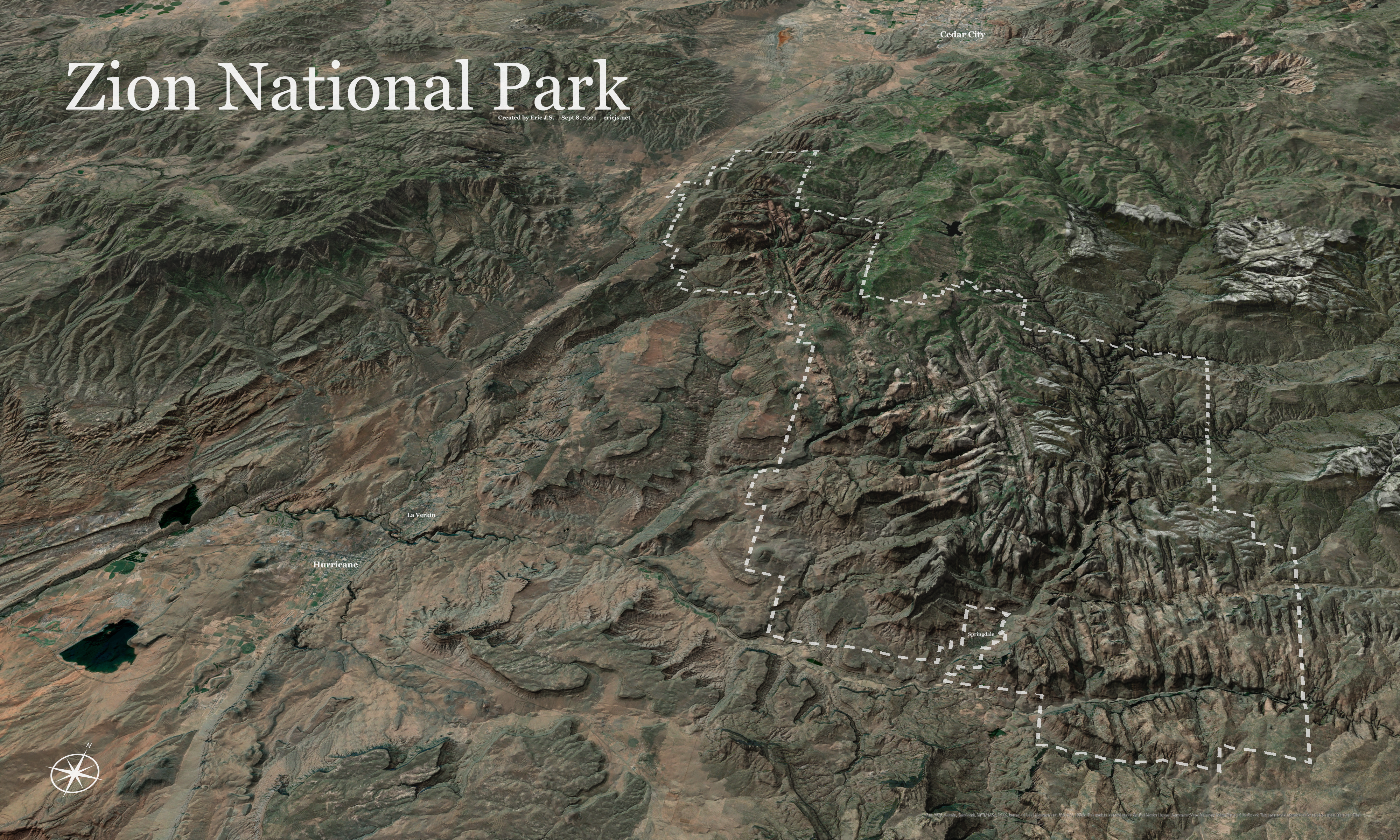 I used a combination of hillshades, aspect, and slope raster layers all blended together to make the shadows. I also exaggerated the 3D terrain by a factor of 1.5 to make the topography stand out. I tried to add 3D labels in ArcGIS Pro, but due to limitations I used Inkscape to add labels instead.